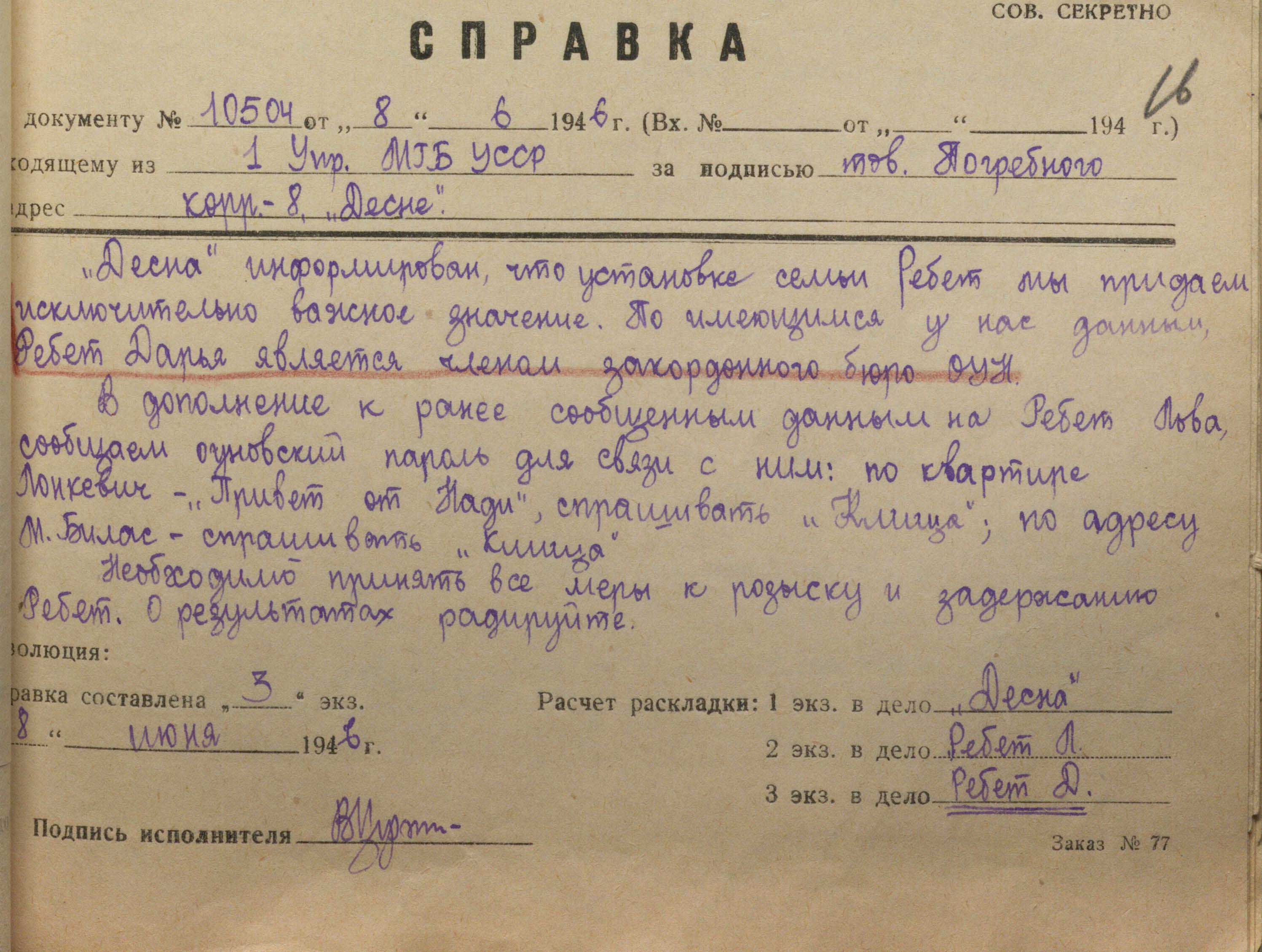В іншому документі, який надійшов у резидентуру мдб срср у Відні в березні 1947 року, йшлося про таке: «Надаючи надзвичайно важливого значення арешту Ребет Д. та її чоловіка, тов. Погрібний просить особисто “Юрія” вжити всіх можливих заходів для їх встановлення і подальшого арешту. Є підстави передбачати, що вони мешкають під вигаданими прізвищами. Для їх встановлення й арешту слід продумати комбінацію з сином. Додатково повідомляємо, що у вихідні з 9 до 12 години їх можна зустріти в костелі Альзеркірхе» (ГДА СЗР України. – Ф. 1. – Спр. 13089. – Арк. 17).