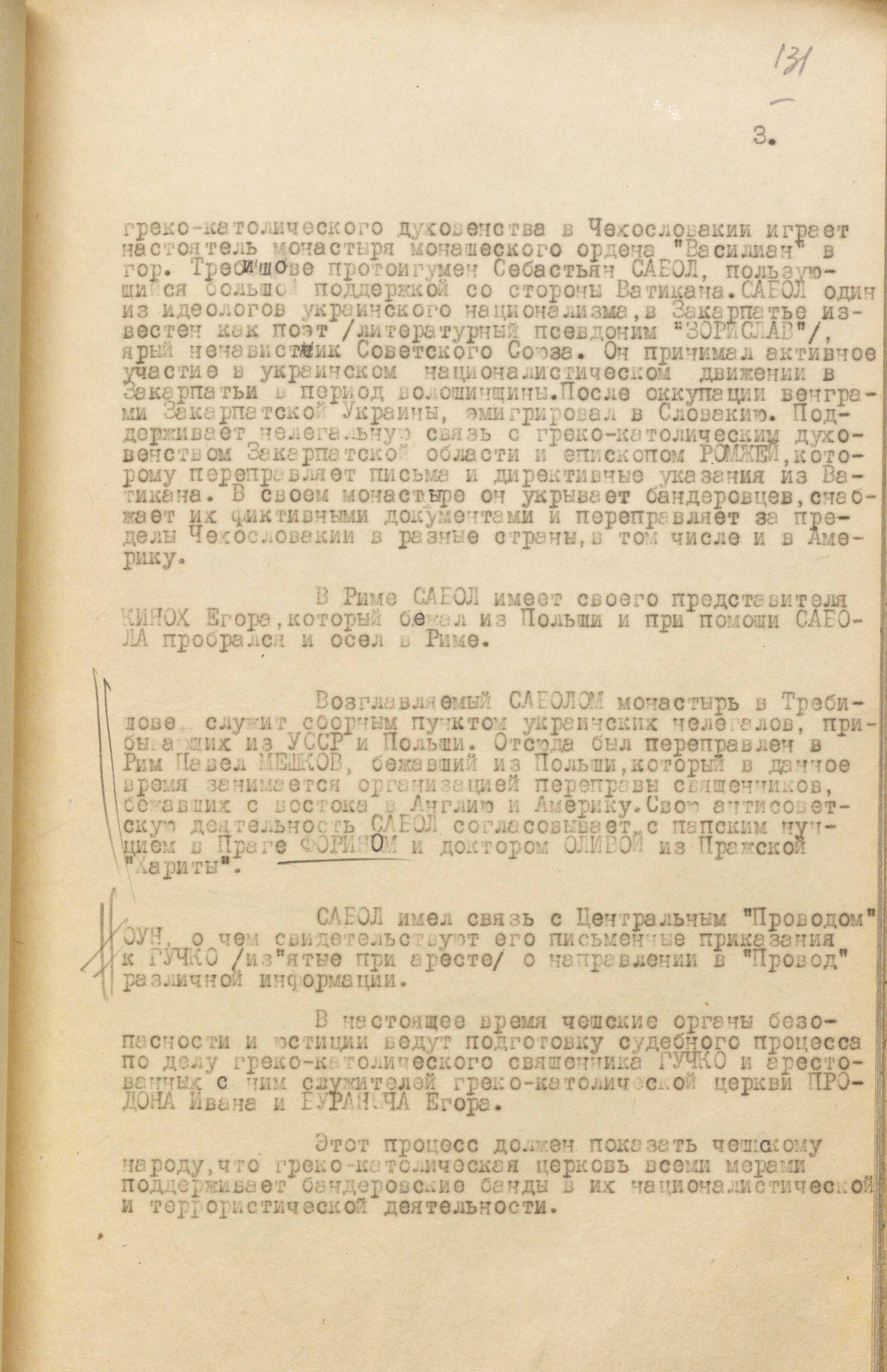 Також встановлено, що значну роль в антирадянській українській націоналістичній діяльності греко-католицького духовенства в Чехословаччині відіграє настоятель монастиря монашого ордену “Василіан” у м. Требишеві протоігумен Севастіян Сабол, який має велику підтримку у Ватикана. Сабол – один із ідеологів українського націоналізму, в Закарпатті відомий як поет (літературний псевдонім Зореслав), непримиренний ненависник Радянського Союзу. Він брав активну участь в українському націоналістичному русі на Закарпатті у період волошинщини. Після окупації угорцями Закарпатської України емігрував до Словаччини. Підтримує нелегальний зв’язок із греко-католицьким духовенством Закарпатської області і єпископом Ромжею, якому пересилає листи і директивні вказівки з Ватикану. У своєму монастирі він переховує бандерівців, забезпечує їх документами і переправляє за межі Чехословаччини в різні країни, зокрема до Америки»