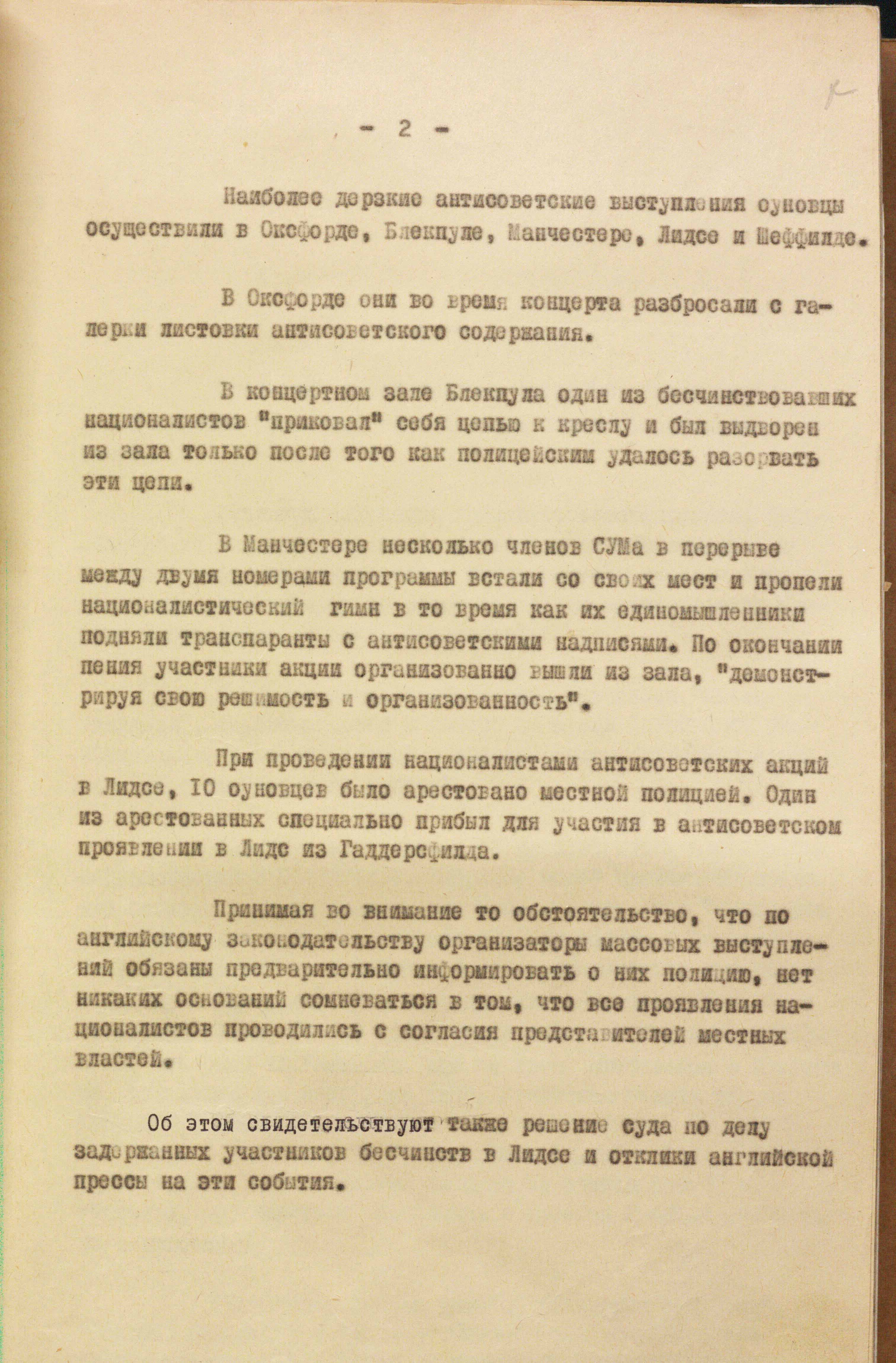 Як зазначається в довідці кдб, у Оксфорді протестувальники розкидали з балкону листівки антирадянського змісту. У концертному залі Блекпулу один із протестувальників прикував себе ланцюгом до крісла і був виведений із зали лише після того, як поліцейському вдалося розірвати ланцюг. У Манчестері кілька членів СУМу у перерві між номерами встали і заспівали «Ще не вмерла Україна…». При цьому інші тримали транспаранти з антирадянськими гаслами. Після того, як доспівали, демонстративно залишили залу.