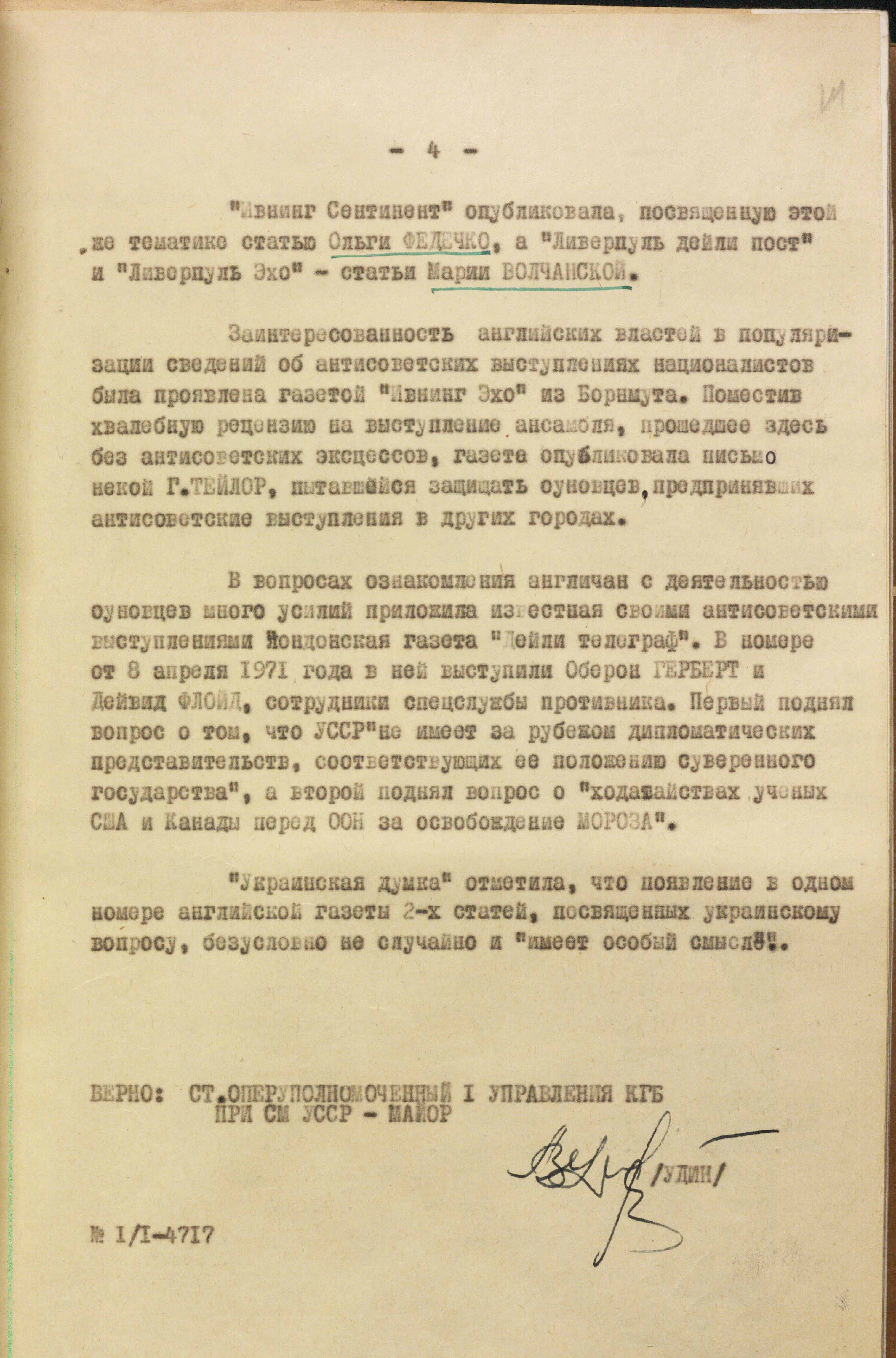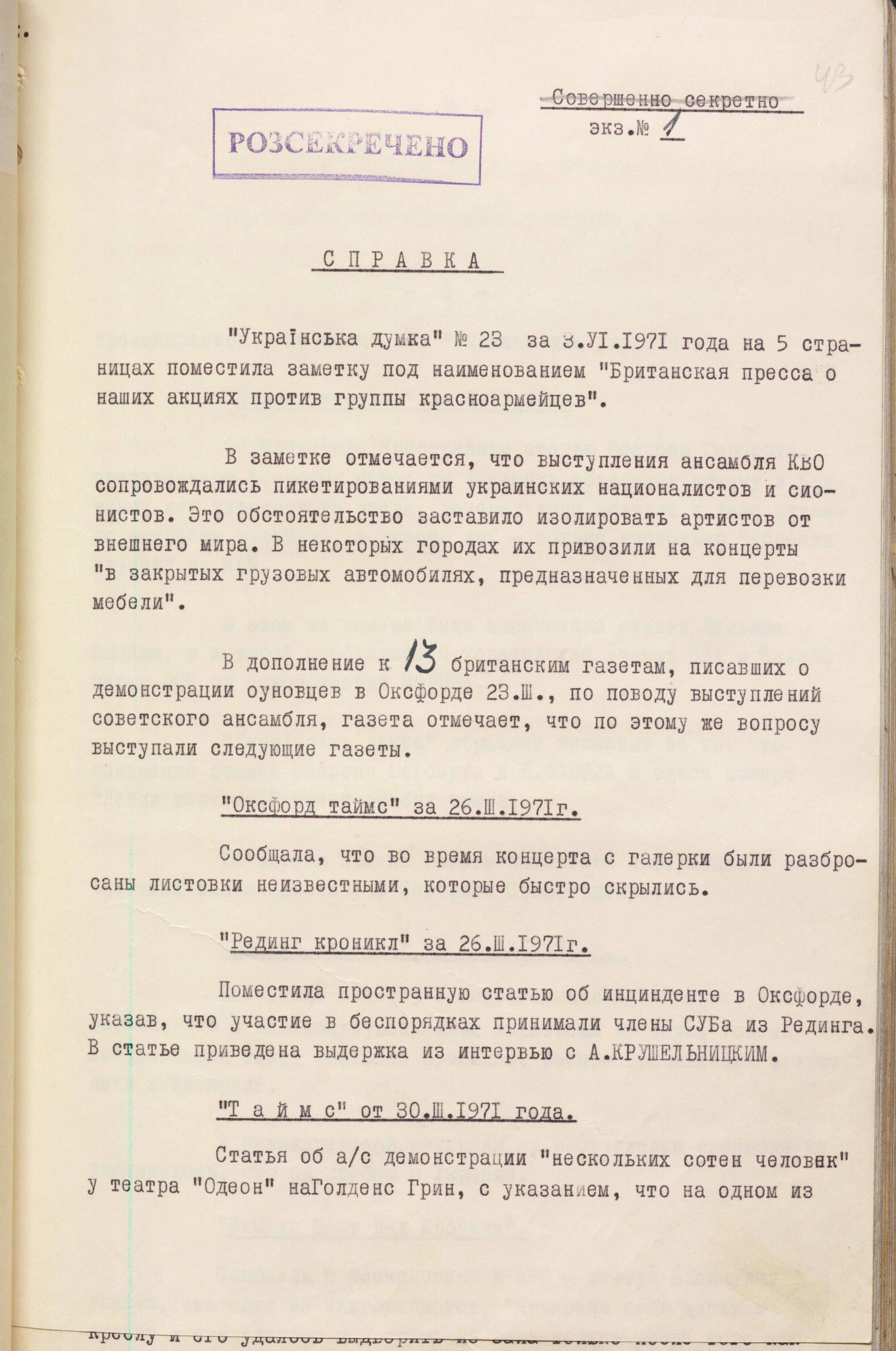 У довідці кдб при раді міністрів урср ідеться про те, що в березні–квітні 1971 року у Великій Британії гастролював ансамбль пісні і танцю Київського військового округу. Але гастролі були затьмарені численними акціями протесту практично в усіх містах – Лондоні, Манчестері, Ліверпулі, Лідсі, Рочдейлі, Бірмінгемі Оксфорді, Блекпулі та Шеффілді. При цьому у протестах брали участь не лише представники українських організацій, а й країн Балтії та інших.