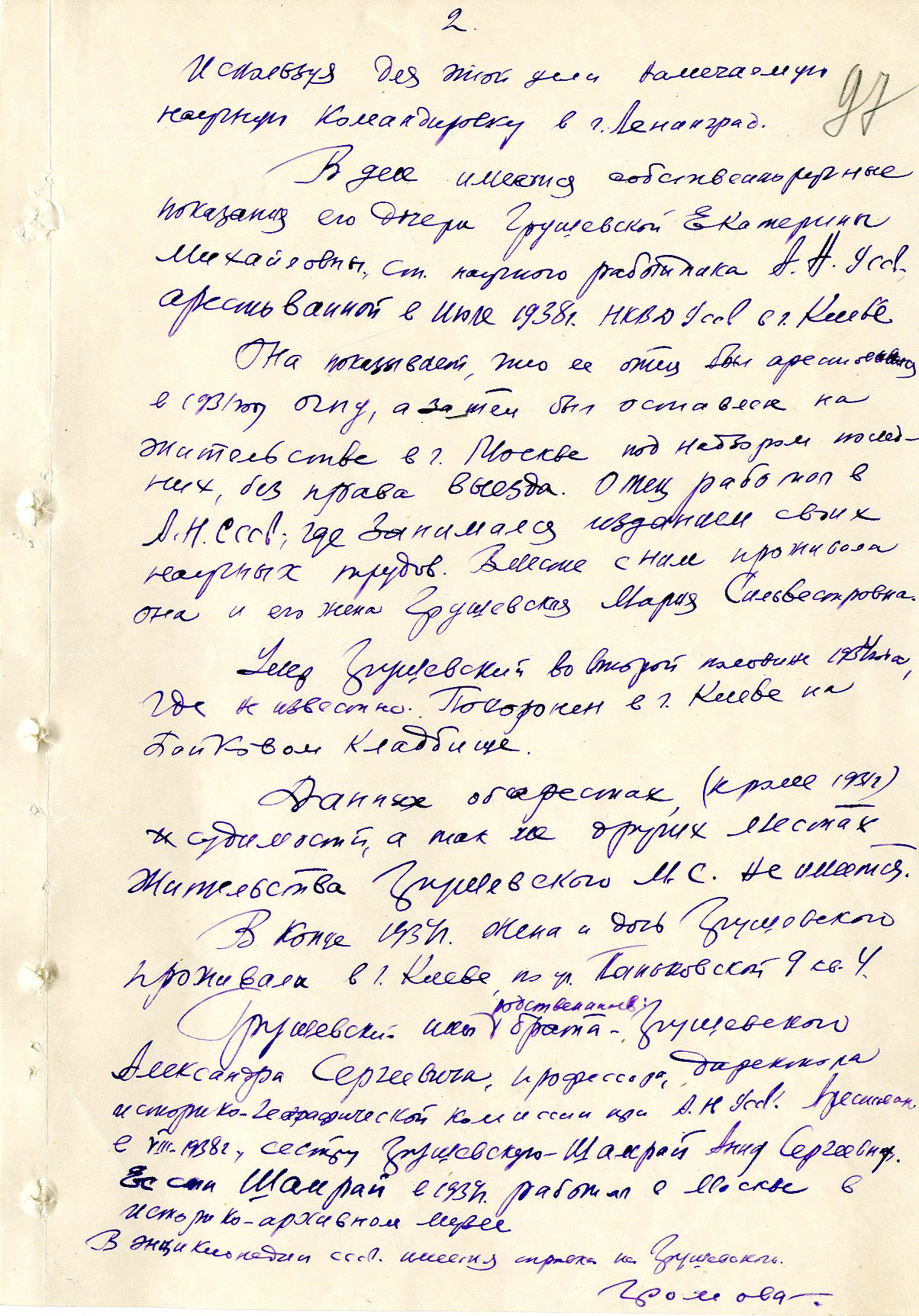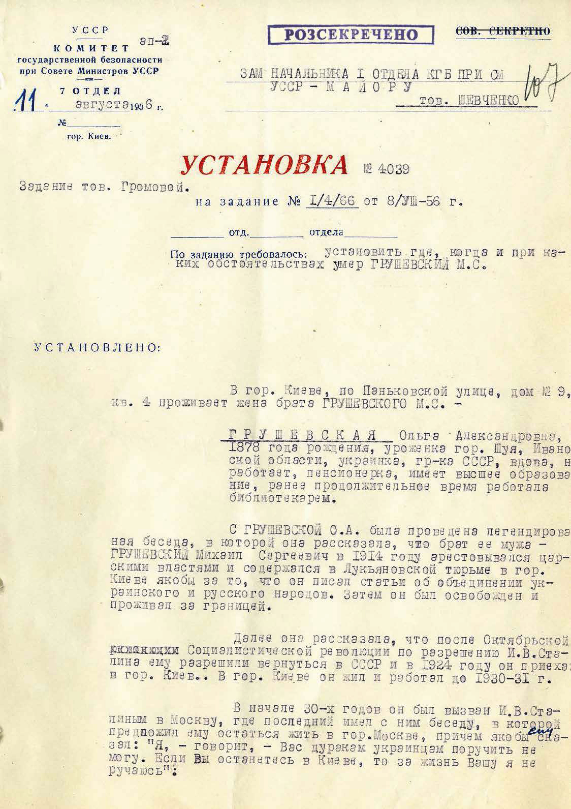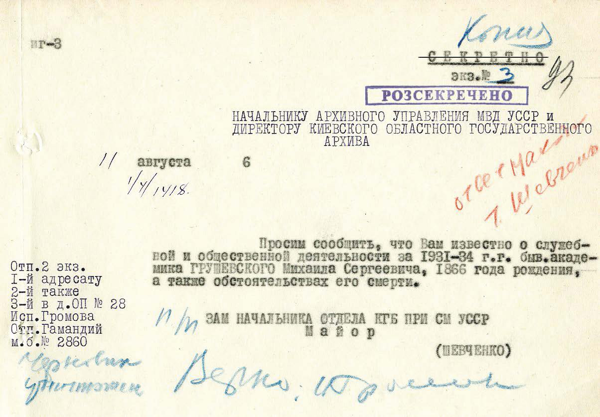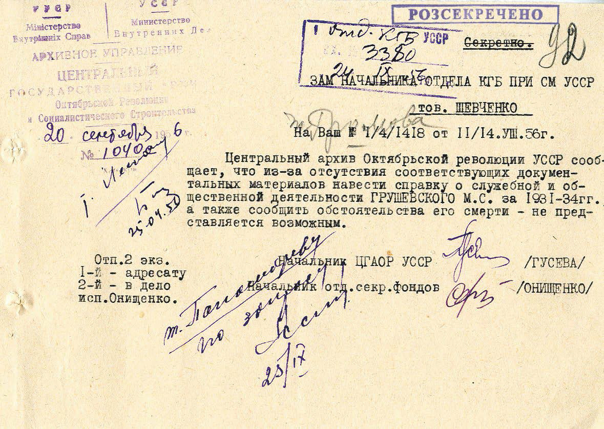 Водночас тоді ж, у серпні 1956 року, на адресу Центрального державного архіву жовтневої революції у Харкові, Київського обласного державного архіву, Архівного управління мвс урср та інших відомств надіслали запити з проханням повідомити, що відомо «про службову і громадську діяльність за 1931–34 рр. колишн. академіка – ідеолога націоналізму Грушевського Михайла Сергійовича, 1866 року народження, а також про обставини його смерті».